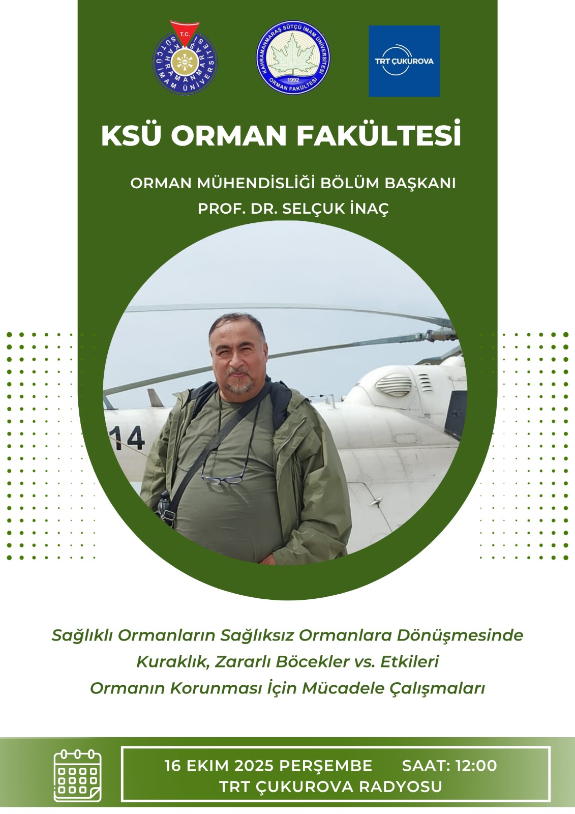Bölüm Başkanımız Sayın Prof. Dr. Selçuk İNAÇ TRT Çukurova Radyosu davetiyle "Sağlıklı Ormanların Sağlıksız Ormanlara Dönüşmesinde Kuraklık, Zararlı Böcek vs. Etkileri, Ormanların Korunması İçin Mücadele Çalışmaları" konulu röportajı olacaktır. Konuya ilişkin afiş; ekimizde yer almakta olup, tüm Öğretim Üyelerimiz, Öğrencilerimiz ve Halkımız davetlidir.